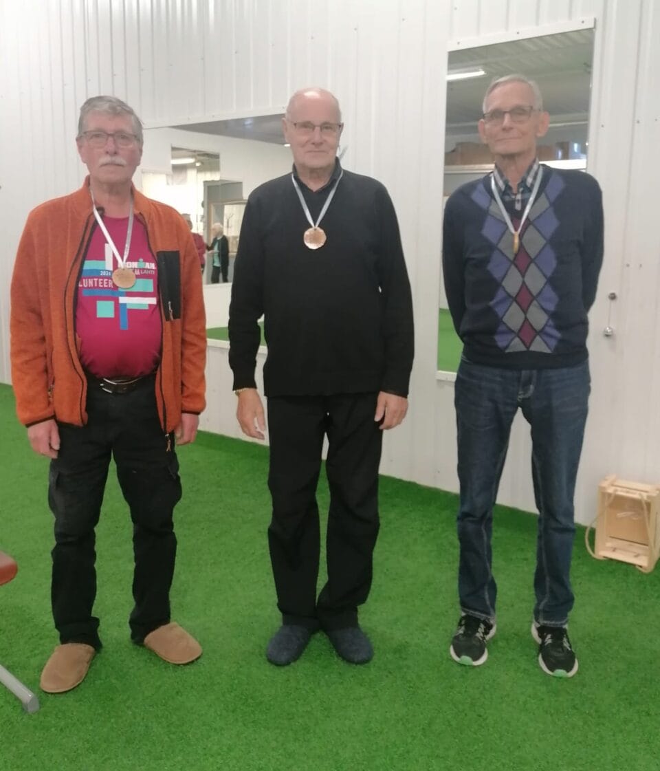 Mölkkymestaruuskisat tomi hallilla 21.10.2025 Naistensarja Sanna Mehto 3 Eeva Salminen 1 ja Liisa Lindblad 2